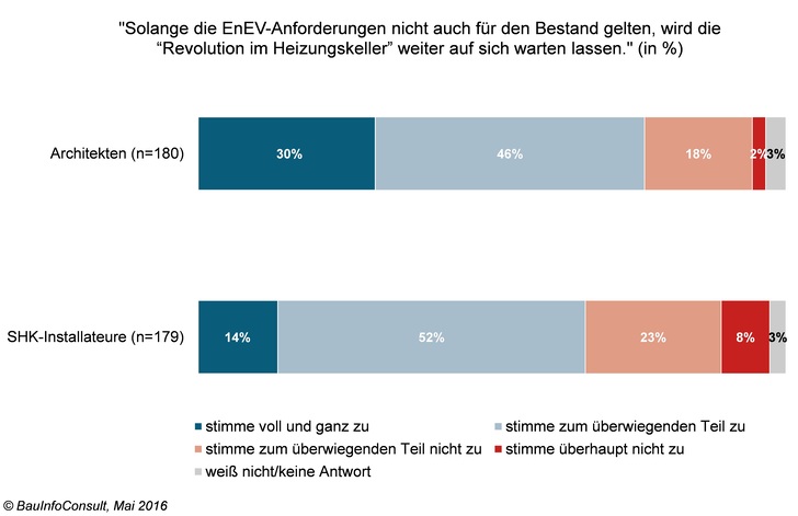 Auch bei den SHK-Installateuren sind 66 % der Befragten der Ansicht, dass es ohne eine verschärfte EnEV im Bestand nicht zu einer massiven Erneuerungswelle in den deutschen Heizungsräumen kommen wird. Knapp ein Drittel ist glaubt, dass dazu keine EnEV-Verschärfung notwendig ist. GLR
