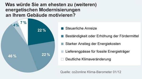 Zwei Drittel der Umfrage-Teilnehmer aus dem aktuellen Klima-Barometer wollen in 2012 ihr Gebäude modernisieren. Steigende Energiekosten sind dabei eindeutig die Hauptmotivation für eine Modernisierung. Das Interesse am Klimaschutz ist der Kostenfrage nachgeordnet, wie die Ergebnisse des von co2online veröffentlichten Klima-Barometers aus dem ersten Quartal 2012 zeigen.