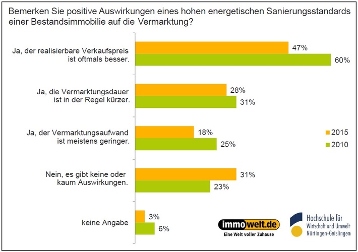 13 1 UMFRAGEN Makler: Energetische Sanierung lohnt sich weniger Nur noch 47 % der Makler glauben, dass sich energetische Sanierungen positiv auf den Kaufpreis auswirken – 2010 waren noch 60 % dieser Überzeugung, das zeigt der Marktmonitor Immobilien 2015 von dem Immobilienportal immowelt.de und Prof. Dr. Stephan Kippes von der Hochschule für Wirtschaft und Umwelt Nürtingen-Geislingen.