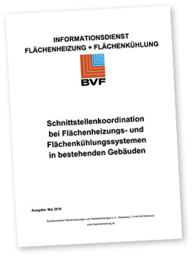 Der Bundesverband Flächenheizungen und Flächenkühlungen e. V. (BVF) hat eine aktualisierte Fassung der „Schnittstellenkoordination bei Flächenheizungs- und Flächenkühlungssystemen in bestehenden Gebäuden“ veröffentlicht. Die Fachinformation für die Abstimmung und Koordination der einzelnen Gewerke bei der Herstellung raumflächenintegrierter Heiz- und Kühlsysteme umfasst 225 Seiten. Sie zeigt übergreifende Zusammenhänge auf und ergänzt die geltenden Normen und technischen Regeln. Die enthaltenen Checklisten und Protokolle dienen der Dokumentation von der Bestandsaufnahme der vorhandenen Fußbodenkonstruktion über die Planung, Ausführung und Bauüberwachung bis zur Übergabe des Gewerks. Auch für die Koordination von Planung und Ausführung beheizter bzw. gekühlter Flächen im Neubau bietet der BVF eine Veröffentlichung an.
