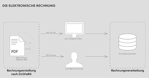 Für Bundesministerien und Verfassungsorgane sind seit dem 27. November 2018 elektronische Rechnungen bindend. Ein Jahr später wird die sogenannte XRechnung verpflichtend für alle weiteren Behörden. Die Pflicht zur Verwendung bzw. Annahme elektronischer Rechnungen zwischen nicht-öffentlichen Auftraggebern und -nehmern tritt zwar erst ein weiteres Jahr später, zum 27. November 2020 in Kraft, Projekt Pro empfiehlt jedoch, die internen Arbeitsabläufe der elektronischen Rechnungsstellung im Planungsbüro frühzeitig vorzubereiten. Mit dem Upgrade 10.4 seiner Software für Controlling und Management erstellt Projekt Pro elektronische Rechnungen nach ZUGFeRD Standard. Die Rechnung wird im hybriden Format erstellt, d. h. sie besteht aus strukturierten, ausschließlich maschinenlesbaren xml-Daten und einem zusätzlichen, inhaltlich identischen PDF mit allen Details. Das xml-Format wurde als gemeinsamer Nenner beim Datentransfer definiert, sodass der automatisch generierte xml-Zusatz direkt in die gängigen Buchhaltungssysteme eingelesen werden kann.