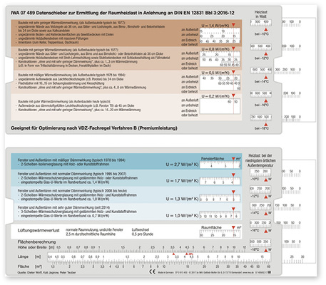 Als Planungshilfe für die hydraulische Optimierung kleinerer Heizungsanlagen z. B. in Einfamilienhäusern oder Etagenwohnungen bietet IWA einen Rechenschieber für die raumweise Heizlastberechnung an. Der Heizlastrechner IWA 07489 macht von den Vereinfachungen Gebrauch, die beim Verfahren B für kleinere Objekte bis ungefähr 500 m² beheizte Fläche nach DIN EN 12831 Beiblatt 3:2016-12 angewendet werden können. Der Nutzer kann vor Ort die Flächen berechnen und Transmissionswärmeverluste ablesen. Die Bauteile sind entsprechend ihrer Beschaffenheit, der Baualtersklasse und ihrem Wärmedurchgangskoeffizienten auf dem Datenschieber angeordnet. Verbesserungsmöglichkeiten durch zusätzliche Wärmedämmung werden ebenfalls angegeben. Beim jeweiligen Bauteil wird die Fläche eingestellt, wobei berücksichtigt wird, ob sie an Außenluft, Erdreich oder einen unbeheizten Raum angrenzt. Der Anwender kann dann die Heizlast entsprechend der niedrigsten Außentemperatur ablesen und so die Transmissionswärmeverluste für Wände, Böden, Decken und Fenster ermitteln. Die Ergebnisse werden in ein Protokoll-Blatt eingetragen. In gleicher Weise erfolgt die Berechnung der Lüftungsheizlast.