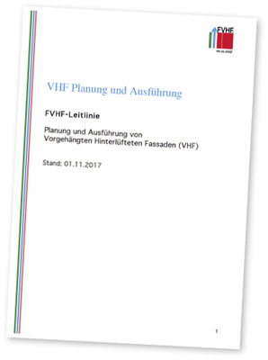 Der Fachverband Baustoffe und Bauteile für vorgehängte hinterlüftete Fassaden e.V. (FVHF) hat in einem Handlungsleitfaden für Bauherren, Planer und Verarbeiter Grundsätze und Mindestanforderungen für dauerhafte und standsichere vorgehängte hinterlüftete Außenwandbekleidungen festgelegt. Die Projektgruppe Technik stellt mit der FVHF-Leitlinie eine Veröffentlichung für die Planung, Bemessung, Konstruktion und Ausführung von vorgehängten hinterlüfteten Fassaden (VHF) mit Bekleidungen auf Metall- und Holzunterkonstruktionen bereit. Im ersten Teil werden der Geltungsbereich und Begriffe geklärt sowie allgemeine Hinweise für die Planung aufgelistet – von der Bauvorlage über Verwendbarkeitsnachweise und Standsicherheit bis zu Bauphysik, Brand- und Wärmeschutz. Das zweite Kapitel ist der Planung und Ausführung gewidmet. Hier werden Vorgaben und Grundsätze erläutert und das gesamte System einer VHF beleuchtet. Des Weiteren beschäftigt sich die Veröffentlichung mit Toleranzen, außerdem veranschaulichen Prinzipskizzen den Aufbau von VHF.