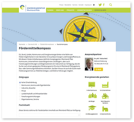 Die neue Förderstrategie Energieeffizienz soll zwar den Förderdschungel lichten (s. Kommentar S. 3), derzeit sind aber Orientierungshilfen noch sehr gefragt. Die Energieagentur Rheinland-Pfalz wendet sich mit ihrem Fördermittelkompass an ganz unterschiedliche Zielgruppen: Kommunen und kommunale Eigenbetriebe, Industrie und Gewerbe, Privatleute, Landwirte und Winzerbetriebe, Forschungseinrichtungen sowie Organisationen und Vereine erhalten mit wenigen Klicks einen Überblick über Förderprogramme, die in Rheinland-Pfalz verfügbar sind. Nach Eingabe der Postleitzahl ermittelt das Online-Tool für sechs Gebäudetypen und gegliedert nach 40 möglichen Bau- und Sanierungsmaßnahmen Förderprogramme von Land und Bund sowie von EU, Kommunen und Versorgern.