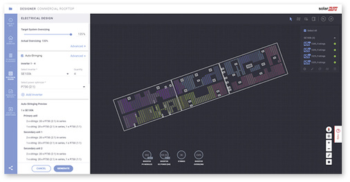 Speziell für PV-Gewerbeanlagen hat SolarEdge sein webbasiertes PV-Design-Tool um neue Features erweitert. Um den Eigenverbrauch in Gewerbeprojekten mit SolarEdge-Anlagen zu maximieren, können Nutzer nun aus einer Liste das am besten geeignete Verbrauchsprofil auswählen. Enthalten sind Gewerbe-Lastprofile, die typische Energieverbrauchsmuster repräsentieren, z. B. Produktionsstätten, Läden und Bürogebäude. Zudem wurde die Modellierung erleichtert, unter anderem durch die Mehrfachauswahl von Objekten, Copy & Paste sowie eine verbesserte Kantenausrichtung. Für die elektrische Auslegung von PV-Gewerbeanlagen bietet der Designer jetzt ein Auto-Strang Auslegungsfeature, das auf Knopfdruck den flexiblen Auslegungsregeln von SolarEdge folgt. Auch verkabelte Modulblöcke können dupliziert werden. In die Energiesimulationen sind Verschattungsanalysen im Rahmen der Energiesimulationsrechnung und zusätzliche Anlagenverluste einbezogen. Zu den erweiterten Optionen für Anlagenverluste gehören Verschmutzung und Schnee, Wärmeverlust, lichtinduzierte Degradation (LID), Einfallswinkelmodifikator und Nichtverfügbarkeit des Systems. Eine detaillierte Analyse der Bestrahlungsstärke ist ebenfalls enthalten, um die PV-Auslegung zu optimieren.