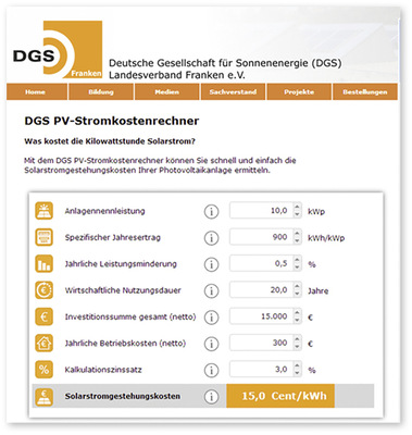 Der DGS stellt auf seiner Website einen Stromkostenrechner zur Verfügung, mit dem sich schnell überschlagen lässt, wie viel eine Kilowattstunde Solarstrom kostet. Nach der Eingabe von Anlagennennleistung, spezifischem Jahresertrag, jährlicher Leistungsminderung, wirtschaftlicher Nutzungsdauer, Nettoinvestitionssumme, jährlichen Nettobetriebskosten und dem Kalkulationszinssatz berechnet das Tool die Nettosolar- Stromgestehungskosten . Die ermittelten Kosten können beispielsweise mit dem Wert eingekauften Netzstroms verglichen oder mit der EEG-Vergütung in Beziehung gesetzt werden.