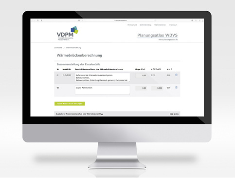 Der WDVS-Planungsatlas wurde erweitert. Bislang berücksichtigte er bei der Wärmebrückenberechnung nur WDVS-Details. Um einen vollständigen Nachweis für das gesamte Gebäude führen zu können, lassen sich eigene Konstruktionen, die nicht an das WDVS anschließen, hinzufügen. Die manuell ergänzten Komponenten fließen in das Gesamtergebnis ein und der Wärmebrückennachweis kann in einer Anwendung komplett erstellt werden. Registrierte Nutzer haben die Möglichkeit, ein eigenes Profil anzulegen und die Daten der manuell eingepflegten Baukomponenten zur späteren Weiterbearbeitung zu speichern. Ein Handbuch im PDF-Format erleichtert den Einstieg in die Arbeit mit dem Planungsatlas. Das Onlinetool erscheint jetzt im neuen Layout des Verbands für Dämmsysteme, Putz und Mörtel e.V. (VDPM).