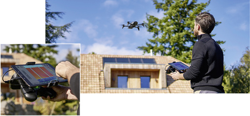 Zu den Businesslösungen von Parrot gehört die Bebop-Pro Thermal, mit der Dächer vom Boden aus betrachtet werden können. Auch schwer zugängliche Bereiche, denkmalgeschützte Gebäude oder ungewöhnliche Dachformen wie Kirchtürme, die das Aufstellen von Gerüsten oder Leitern erschweren, lassen sich damit effizient inspizieren. Der Mehrzweck-Quadcopter arbeitet mit einer Video- und einer Wärmebildkamera. Mit der Front-Full-HD-Kamera können bestimmte Areale oder Gebäude in Echtzeit visuell begutachtet werden. Verrutschte Ziegel, beschädigte Fassadenteile oder andere Schäden können fotografiert und später detailliert ausgewertet werden. Die Flir-One-Pro Wärmebildkamera ermöglicht thermographische Untersuchungen aus der Luft, um z. B. Wärmebrücken oder Durchfeuchtungen auf dem Dach zu identifizieren. Über die FreeFlight Thermal App erhält der Pilot nicht nur Zugang zu Einstellungen und Flugdaten der Drohne, sie überträgt auch Bilder der beiden Kameras direkt auf ein verbundenes Tablet. Die App ist kompatibel mit Tablets, die auf Android laufen, eine iOS-Version soll folgen. Der Nutzer kann live Videos streamen oder auf dem 32-GB-Speicher der Drohne speichern sowie Gebäude, Dächer oder Solarmodulen fotografieren. Als weitere Stärken nennt der Hersteller, dass der Quadcopter mit einer Akkuladung 25 Minuten in der Luft verbringen kann, Windgeschwindigkeiten bis 63 km/h standhält, mit dem Parrot Skycontroller 2 eine Reichweite von 2000 m hat und dank GPS-Unterstützung auf Knopfdruck zum Ausgangspunkt zurückkehrt.