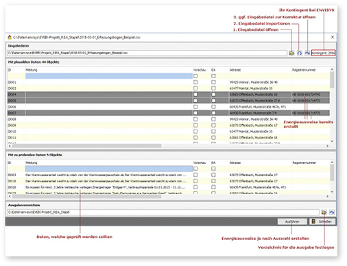 Mit Einführung der EnEV 2007 wurden Energieausweise für Gebäude bei Vermietung und beim Verkauf zur Pflicht. Nach einer Gültigkeit von zehn Jahren sind für viele Gebäude 2018 bzw. 2019 Folgeausweise zu erstellen. Energieberater bei Immobilienverwaltungen, Ablesern und Energieversorgern stehen vor einem Berg von Aufgaben. Hierfür hat Envisys eine spezielle Software entwickelt, die diese Arbeit rationalisiert. Mit Energieausweise Stapelverarbeitung können Energieausweise nach Verbrauch für Wohngebäude im Stapel erstellt werden. Im Anschluss an den Import mehrerer Objektdatensätze lassen sich entsprechend viele Energieausweise generieren. Die Daten werden z. B. in einer MS Exceltabelle erfasst und in die Software importiert. Das Programm überprüft die Daten auf Vollständigkeit, Einhaltung der EnEV-Bestimmungen sowie Plausibilität und stellt sie übersichtlich in einer Maske dar. Für ungültige bzw. nicht plausible Datensätze werden Meldungen angezeigt, die Objektdaten können direkt korrigiert werden. Vorschläge für Modernisierungsmaßnahmen generiert die Software automatisch in Abhängigkeit von Baualter, Heizung, angegebenen Sanierungen und ermittelter Energiekennzahl. Die Energieausweise können in der Vorschau oder direkt erzeugt werden. Wie die Anmeldung beim DIBt erfolgt auch die Übernahme der Registriernummern in die Energieausweise automatisch. Die Ausstelleradresse einschließlich digitaler Unterschrift und Logo wird dabei in die Energieausweise eingetragen. Sind Objektbilder vorhanden, werden sie ebenfalls übernommen. Für die Eingabe der Objektdaten bietet Envisys zusätzlich eine Erfassungstabelle (MS Excel) an.