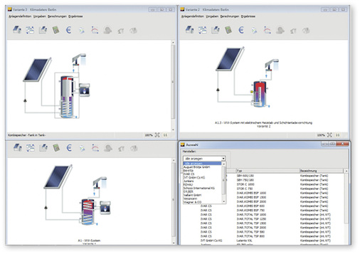 Mehr als 3650 Flach- und Röhrenkollektoren sowie über 1550 Kessel und Nachheizungen sind in den Datenbanken der Version T-SOL 2018 von Valentin Software abrufbar. Speicher können Anwender des Simulationsprogramms jetzt ebenso wie Kollektoren und Kessel selbst definieren und abspeichern. Für die Optimierung solarthermischer Anlagen lässt sich jede Komponente (Kollektor, Rohre, Speicher, Kessel usw.) einzeln parametrieren. Die Parametervariation ermöglicht auch, mehrere Simulationen gleichzeitig durchzuführen, um beispielsweie Kollektorflächen und Speichervolumina automatisch zu dimensionieren. Für die Auswertung der Ergebnisse bietet das Programm den Projektbericht mit detaillierten Simulationsausgaben als Nachweis im Rahmen von Förderanträgen beim BAFA und der KfW sowie Grafiken mit einer großen Auswahl an Temperaturen und Energien für eine tiefer gehende Analyse. Auch ein Energielabel nach EU-Richtlinien kann mit T-SOL erstellt werden.
