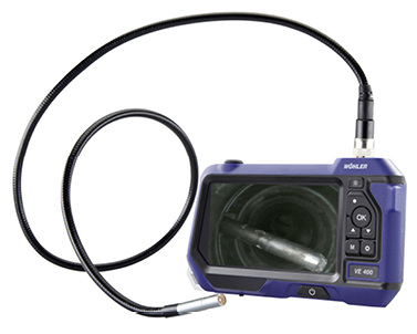 Dem Wöhler VE 400 HD-Videoskop reichen bereits kleinste Öffnungen, um Bilder von Hohlräumen zu liefern, und das in HD-Qualität. Die Kamera ist mit unterschiedlichen Sonden ab 3,9 mm Durchmesser erhältlich. Alle Sonden sind wasserdicht nach IP 67, sodass sich neben Feuerstätten, Brennräumen und Verbindungsstücken auch Vorwandinstallationen, Ausgüsse und Abflussleitungen inspizieren lassen. Voraussetzung ist eine Öffnung mit einem Durchmesser ab 5 mm. Bei der etwas größeren Sonde mit 5,5 mm Durchmesser kann die Blickrichtung von 0° geradeaus auf 90°-Seitsicht umgestellt werden, sodass auch in engen Hohlräumen ein umfassender Blick möglich ist. Optional wird eine 3 m lange Abwassersonde mit einem 25-mm-Kamerakopf angeboten. Wer bereits mit einem Wöhler VE 200 Video-Endoskop arbeitet, kann die vorhandenen Sonden in Verbindung mit dem VE 400 nutzen. Ausgeleuchtet wird der Inspektionsbereich mit den Sonden-LEDs und einer Zusatzlampe mit vier LEDs. Das Videoskop nimmt Fotos oder Videos auf, wenn gewünscht auch mit Ton. Die Anzeige im 5"-Display lässt sich per Tastendruck drehen. Bild- und Videodateien werden auf einer SD-Karte gespeichert und verwaltet oder per USB-Kabel auf den PC übertragen.